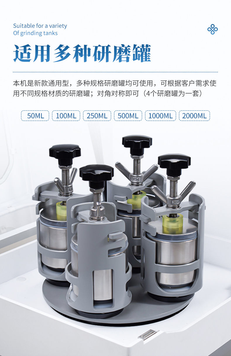 1. 適用研磨罐:本機是新款通用型,50ml規格研磨罐,可根據客戶需求使用不同材質的研磨罐;對角對稱即可(4個研磨罐為一套)。